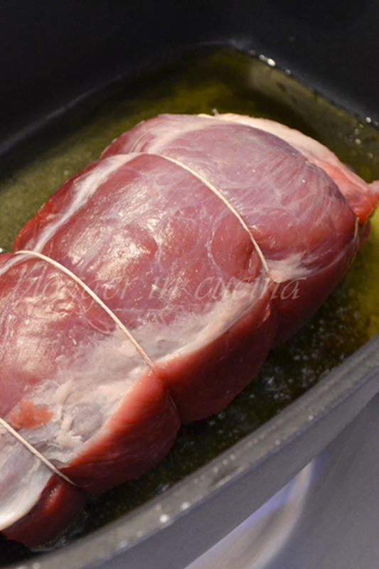 Legare l’arrosto con dello spago, quindi rosolarlo da tutti i lati in olio e burro.