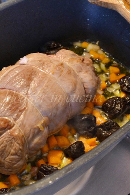 Una volta sigillata la carne, aggiungere scalogno, carote e sedano a tocchetti, poi le prugne denocciolate e delle aromatiche a piacere.