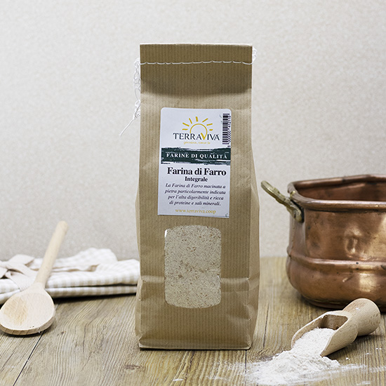 Farina di Farro integrale macinata a pietra come una volta, conservando la parte integrale del chicco di farro.