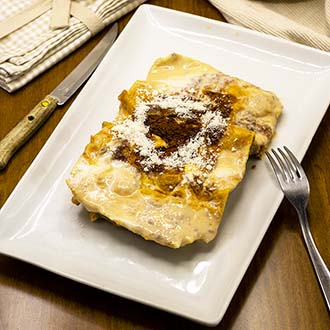 Lasagne con besciamella, ragù di Bovino di Razza Piemontese Fassone e prosciutto cotto preparate con metodo tradizionale.