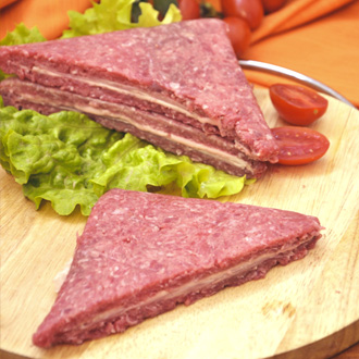 Carne magra macinata di bovino adulto di Fassone di Razza Piemontese con all'interno prosciutto cotto e formaggio.