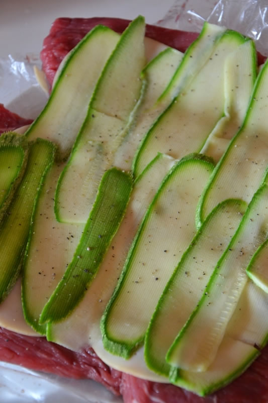 Poi, procedere con uno strato di zucchine. Salare leggermente ed eventualmente aromatizzare con delle erbe a piacere, come della maggiorana o della salvia. Se si vuole, si può procedere con un secondo strato di scamorza a fette. Richiudere la fetta di carne arrotolandola su se stessa, mantenendo la chiusura verso il basso.