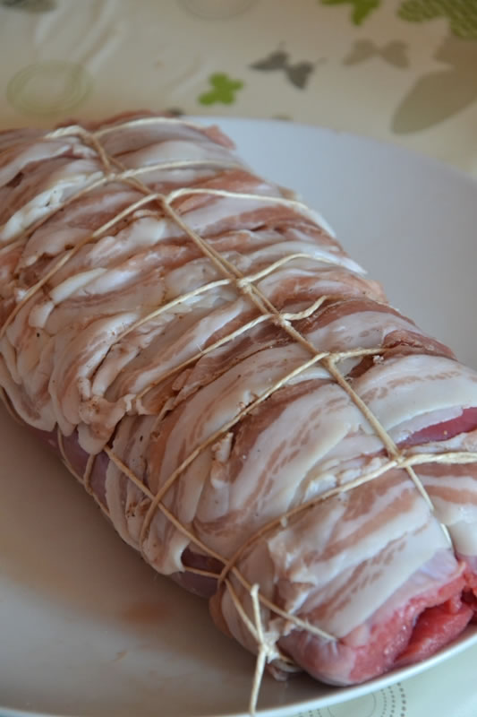 Avvolgere accuratamente l’arrosto con delle fettine di pancetta, quindi procedere alla legatura con lo spago. Fissare lo spago circondando il perimetro dell’arrosto e procedere ad una seconda legatura perpendicolare alla prima.