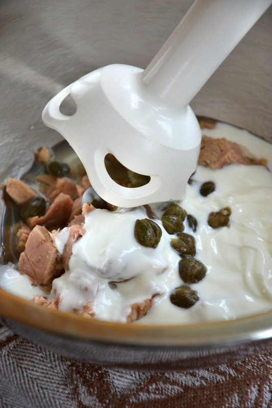 Per questo motivo consiglio di preparare la carne il giorno prima per il giorno dopo, in modo tale da avere una carne ben fredda e compatta al momento del taglio. Procedere con la preparazione della salsa: in una ciotola capiente, unire yogurt greco, tonno sgocciolato, capperi e acciughe, pepando leggermente.